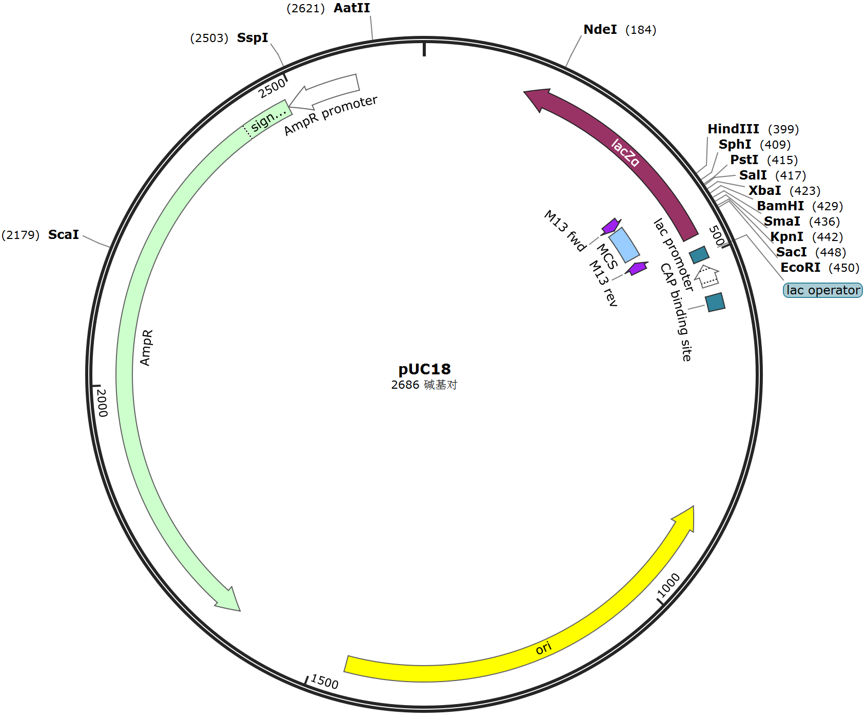 pUC18是一種由pBR322改造而來的質(zhì)粒載體,全長2686bp。在質(zhì)粒的多克隆位點(diǎn)(MCS)上下游含有M13正向和反向引物結(jié)合位點(diǎn),以便于對插入的DNA片段進(jìn)行常規(guī)測序。本方法采取同源重組的策略代替?zhèn)鹘y(tǒng)的TA克隆,實(shí)現(xiàn)對任何PCR片段的快速克隆。