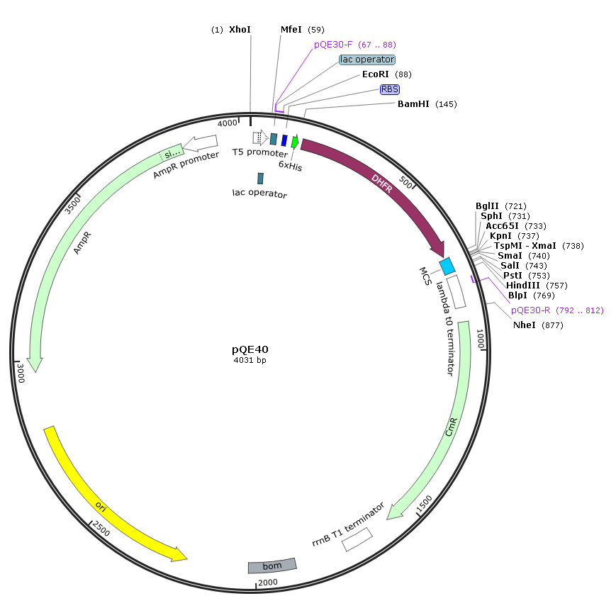 pQE-40 pQE vectors and constructs can be maintained in any E. coli strain that is ampicillin-sensitive and carries the pREP4 repressor plasmid, or harbors the lacIq gene on the F-factor episome. 配套表達(dá)菌株為M15[pREP4]感受態(tài)細(xì)胞。M15[pREP4]菌株攜帶有阻抑質(zhì)粒pREP4,該質(zhì)粒高水平的表達(dá)lac抑制子,在IPTG誘導(dǎo)前反式抑制蛋白表達(dá)。通過(guò)卡那霉素抗性篩選可以保持pREP4質(zhì)粒在菌株中的穩(wěn)定性。