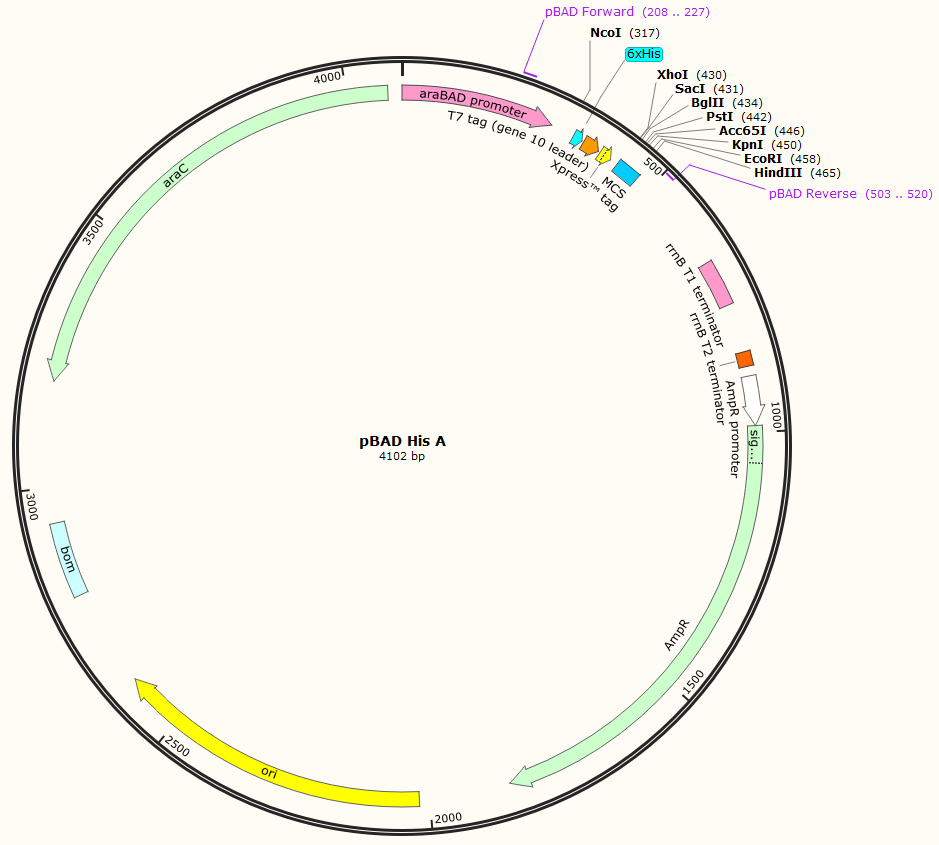 pBAD/His和PBAD/Myc-His載體質(zhì)粒是衍生于pBR322載體。載體設(shè)計用來在大腸桿菌中進行可調(diào)節(jié),劑量依賴性的表達和純化重組目的蛋白。使用大腸桿菌araBAD啟動子(pBAD)增強了大腸桿菌重組蛋白可溶性表達的水平。pBAD/His和pBAD/Myc His載體上的調(diào)節(jié)蛋白AraC能夠調(diào)控pBad啟動子。