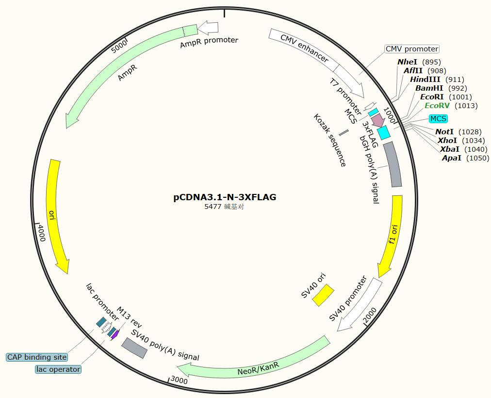 基本信息 載體類型: 哺乳動物細胞表達載體 載體抗性: Amp 載體標簽: 3Flag 篩選標記: Neomycin / G418 啟動子: CMV 表達水平: 高 載體大小: 5477 克隆方法: 多克隆位點,限制性內(nèi)切酶 5' 測序引物: pcDNA3.1-F:CTAGAGAACCCACTGCTTAC 3' 測序引物: pcDNA3.1-R (BGH-R):TAGAAGGCACAGTCGAGG 備注: 如有侵權(quán)請產(chǎn)權(quán)持有人盡快聯(lián)系法務15927229196